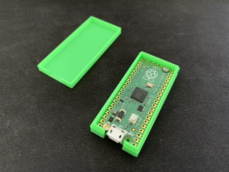 I 3D-Printed a case that fits the Pico. I found it on Thingiverse, you can download it here. The Raspberry Pi Pico is fixed in the case with 4 screws. Unfortunately, the lid does not hold, but a strip of tape solves the problem. Unfortunately, I have not found a better case that does not have cutouts for the pins.